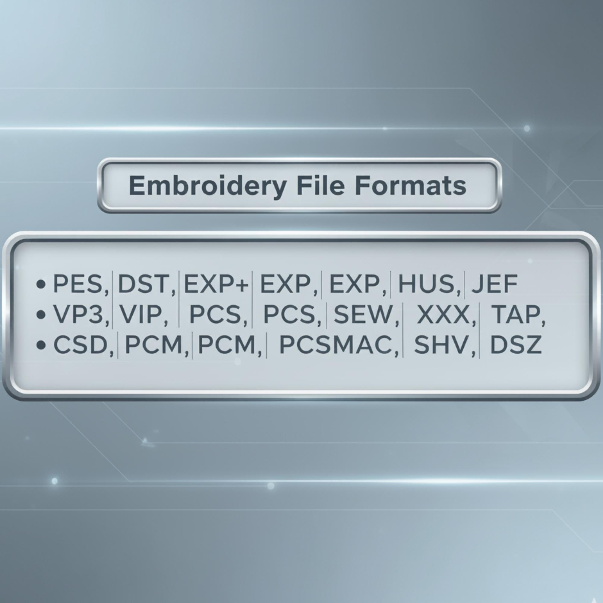✔ Digital embroidery files in multiple formats (PES, DST, EXP+, HUS, JEF, VP3, VIP, PCS, SEW, XXX, TAP, CSD, PCM, PCSMAC, SHV, DSZ)